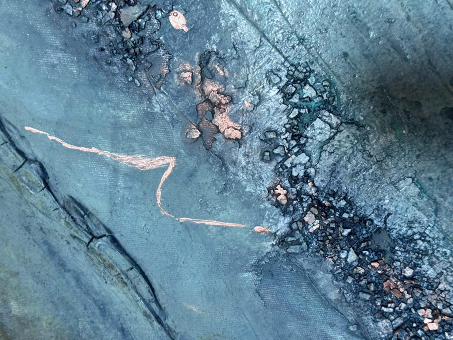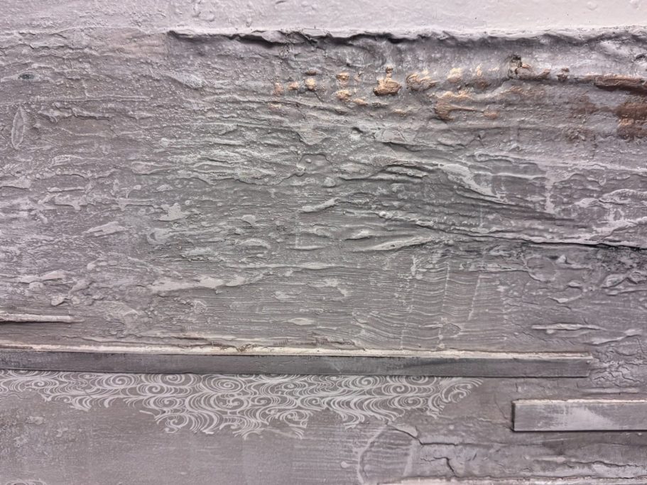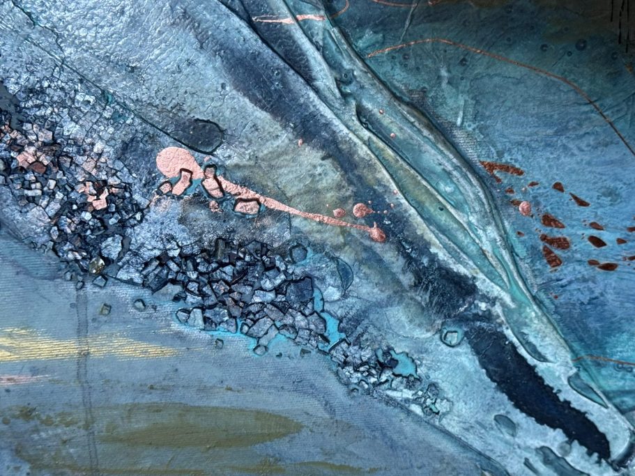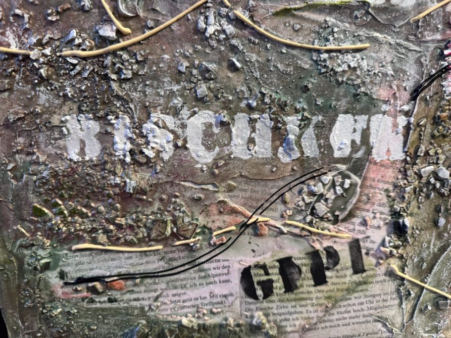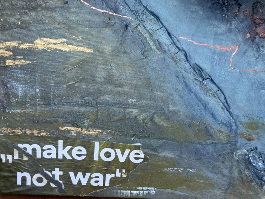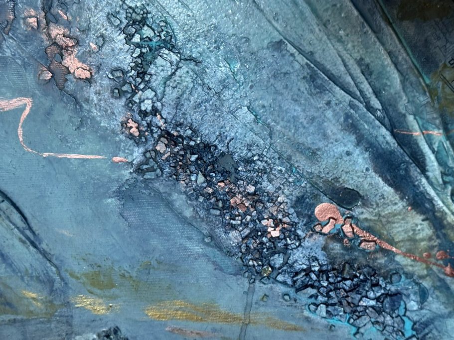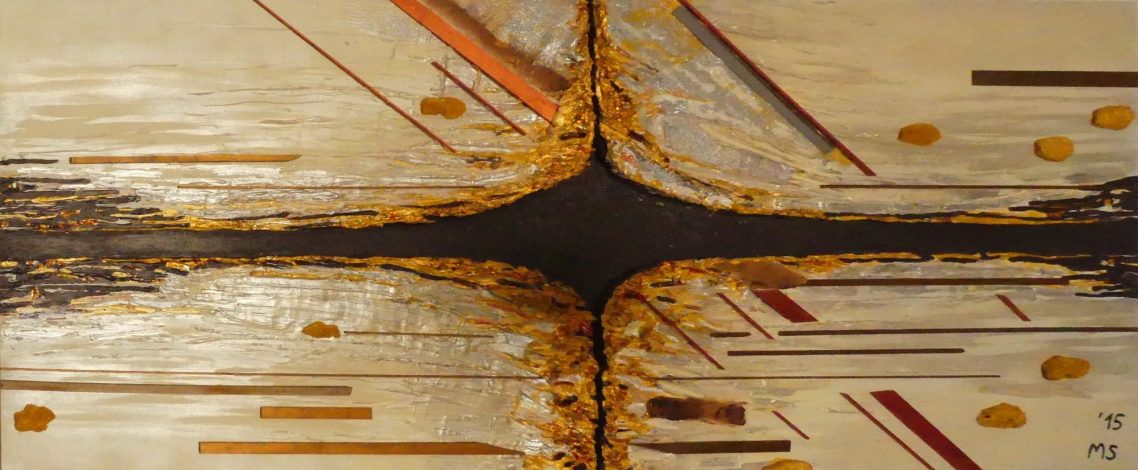 Dieses Bild hat 10 Jahre gebraucht, um es dort hinzuführen, wo es nun ist. Mit Hilfe von Spachtelmasse wurde eine dreidimensionaler Riss im Bild geschaffen. Doch sah ich in dem Bild immer ein christliches Kreuz, verstärkt durch die Goldelemente.