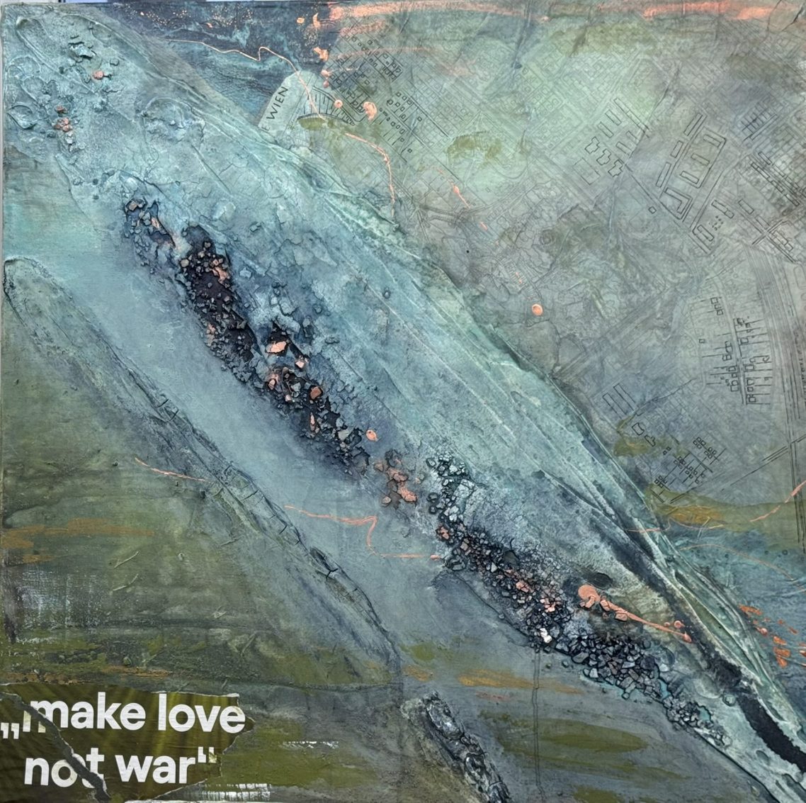 Dieses Werk vereint meine beiden Leidenschaften - Kunst und Architektur. Rechts oben ist ein Stadtplan von Wien eingearbeitet, die mittlere Struktur könnte als Donauinsel interpretiert werden.