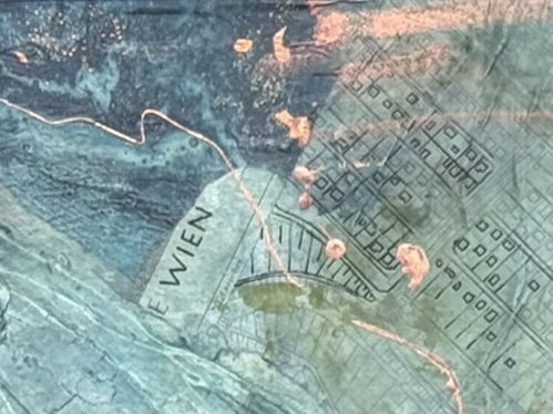 Material: Acryl und Collage auf Leinwand mit Sumpfkalk, Wiener Stadtplan und Tinte