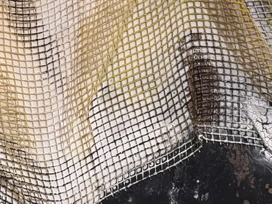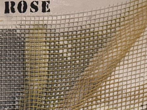 Abstrakte Komposition und Collage mit unterschiedlichsten Strukturen, welche räumlich auf der Leinwand angeordnet wurden. Das Netz definiert die Richtung und das Ebenenspiel, in dem es sowohl satt auf der Leinwand aufliegt, als auch dreidimensional absteht und für einen entsprechenden Schattenwurf sorgt. Das industrialisierte Design wird durch rosa Blumen aufgebrochen.