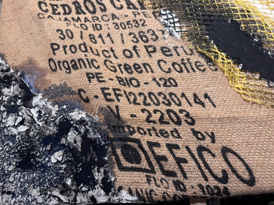 Material: Acryl und Collage auf Leinwand mit Sumpfkalk, Kaffeesack, Netzstruktur, Schablonen, asiatische Papiere und Blumendeko.