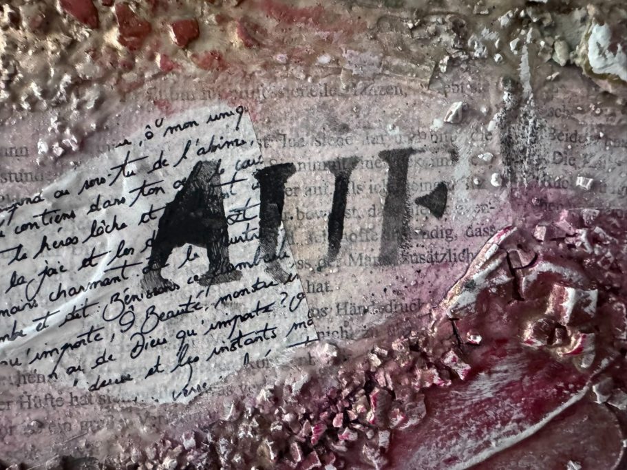 Material: Acryl und Collage auf Leinwand mit Marmormehl, Sumpfkalk, Schablonen, asiatische Papiere und Kopien eines Buches, vollendet mit Blattmetallen