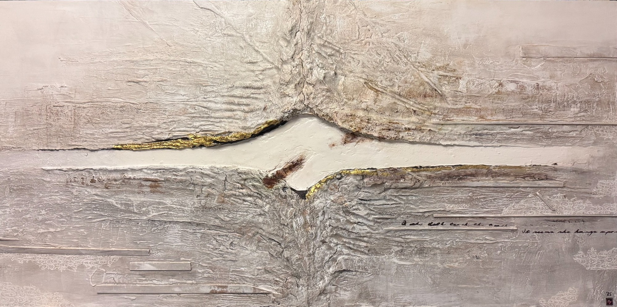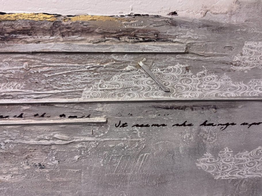 Material: Acryl und Collage auf Leinwand mit Marmormehl, Sumpfkalk, Schablonen, asiatische Papiere und Kopien eines Buches, vollendet mit Blattmetallen