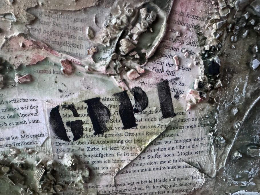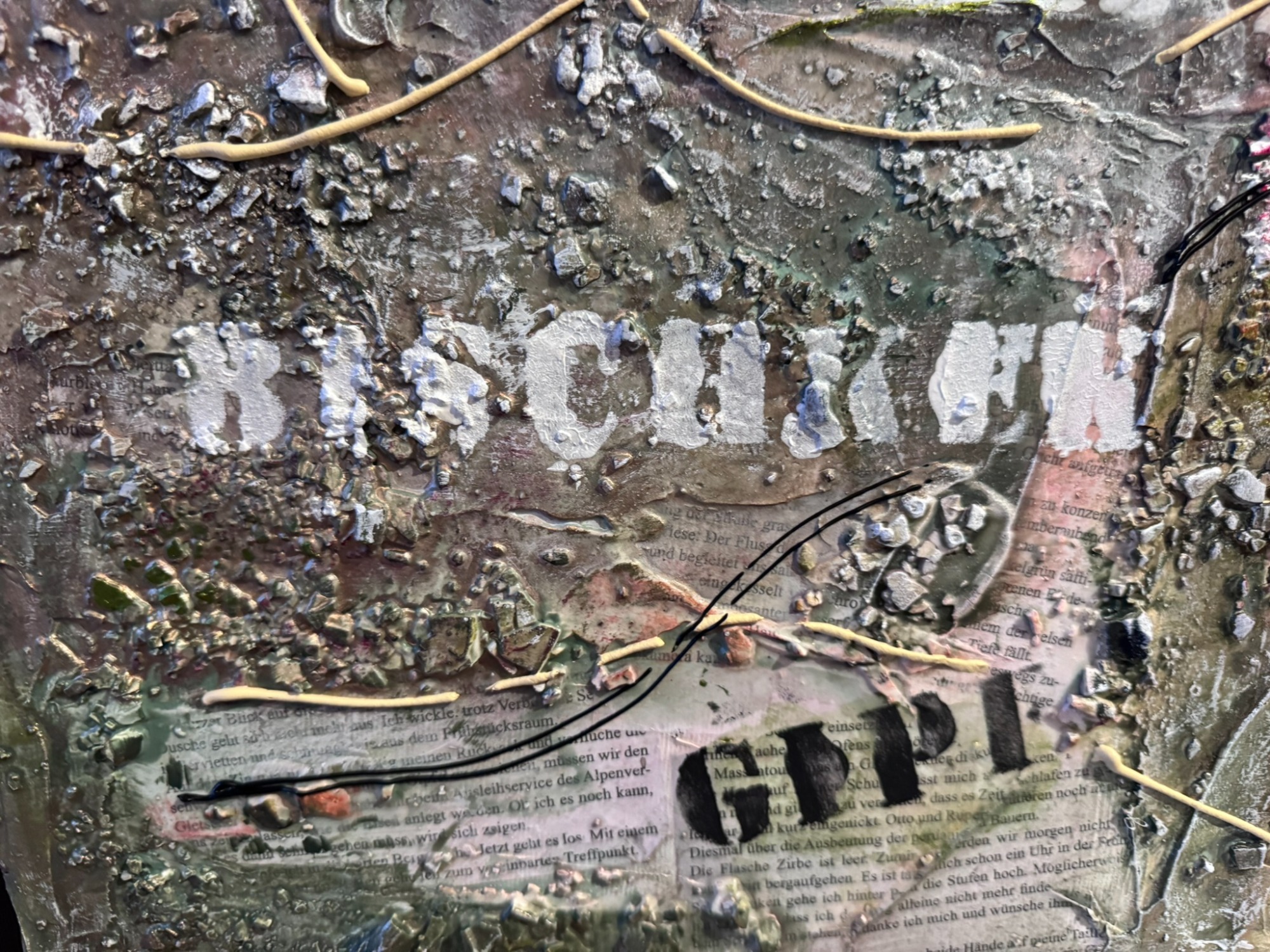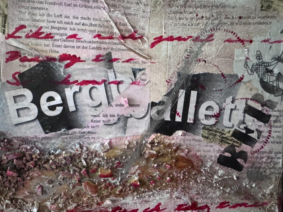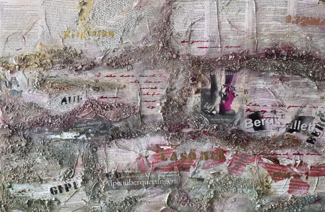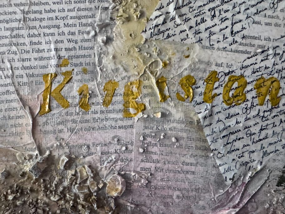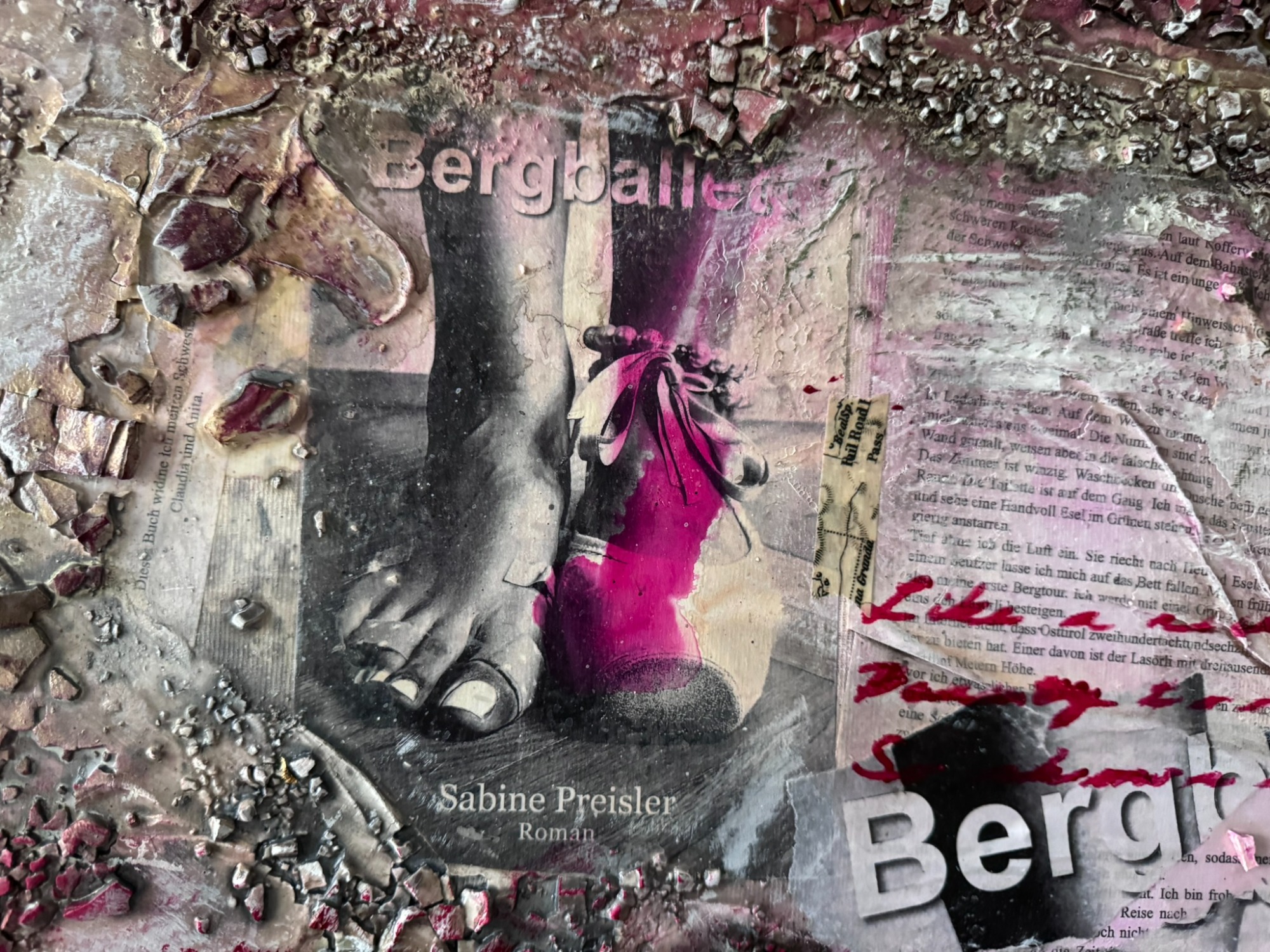 Abstrakte Komposition und Collage mit unterschiedlichsten Strukturen - Marmormehl, Sumpfkalk, Schablonen, asiatische Papiere und Kopien des Buches "Bergballett" von der Schriftstellerin Sabine Preisler, vollendet mit Blattgold und Blattkupfer. Das Bild wurde für die Schriftstellerin gefertigt und soll ihre Identität wiederspiegeln.