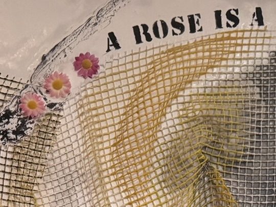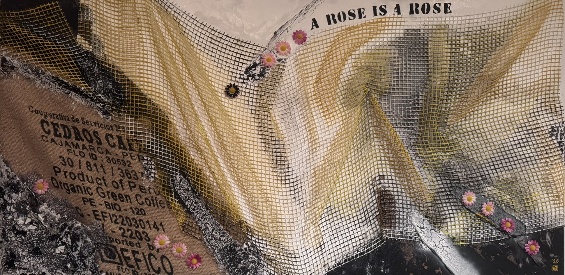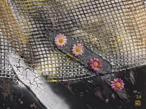 Abstrakte Komposition und Collage mit unterschiedlichsten Strukturen, welche räumlich auf der Leinwand angeordnet wurden. Das Netz definiert die Richtung und das Ebenenspiel, in dem es sowohl satt auf der Leinwand aufliegt, als auch dreidimensional absteht und für einen entsprechenden Schattenwurf sorgt. Das industrialisierte Design wird durch rosa Blumen aufgebrochen.