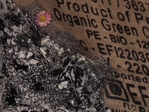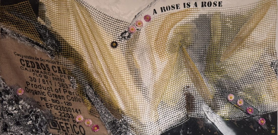 Material: Acryl und Collage auf Leinwand mit Sumpfkalk, Kaffeesack, Netzstruktur, Schablonen, asiatische Papiere und Blumendeko.