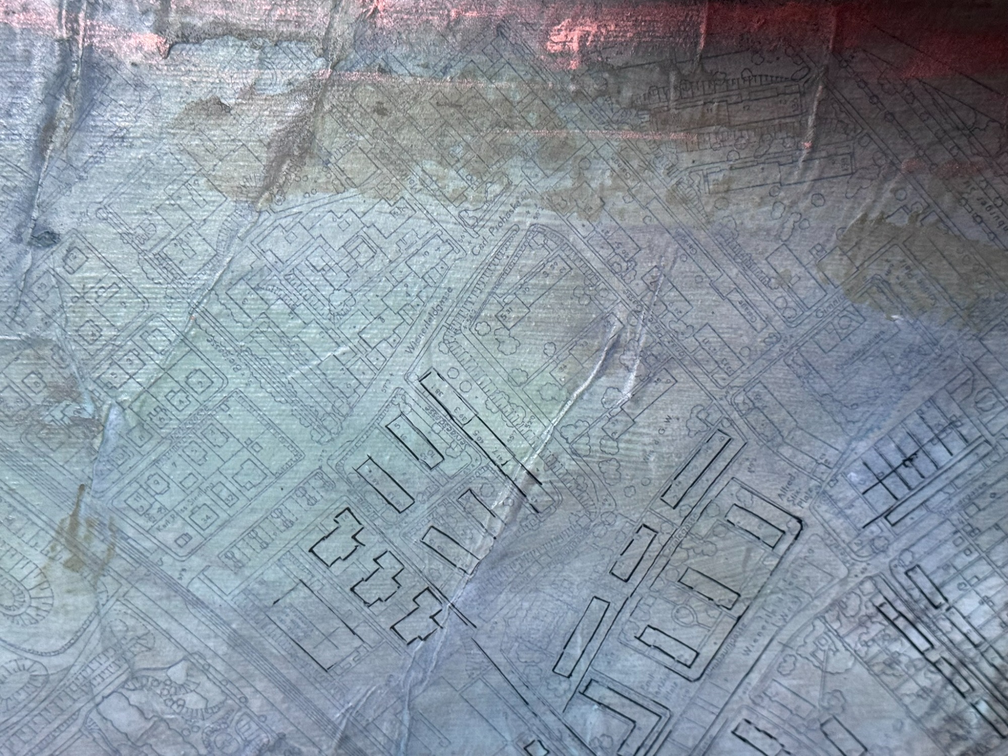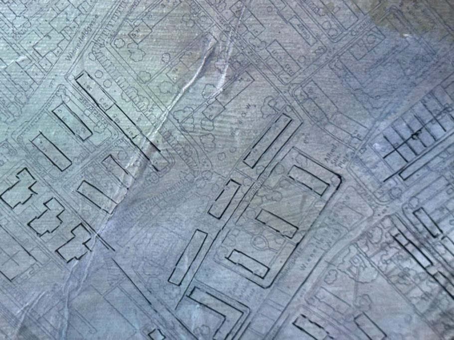 Material: Acryl und Collage auf Leinwand mit Sumpfkalk, Wiener Stadtplan und Tinte